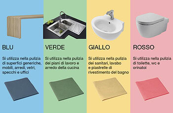 L’utilizzo del codice colore dei panni in microfibra è un metodo strategico per evitare la contaminazione incrociata e massimizzare l’efficacia delle pulizie. In questo sistema, ogni colore rappresenta un’area o una superficie specifica da pulire. Ad esempio, il blu è assegnato alla pulizia delle aree comuni e dei vetri, il verde alla pulizia della cucina e delle superfici a contatto con alimenti, il rosso alla pulizia del WC ed il giallo agli altri sanitari del bagno e alle piastrelle di rivestimento.